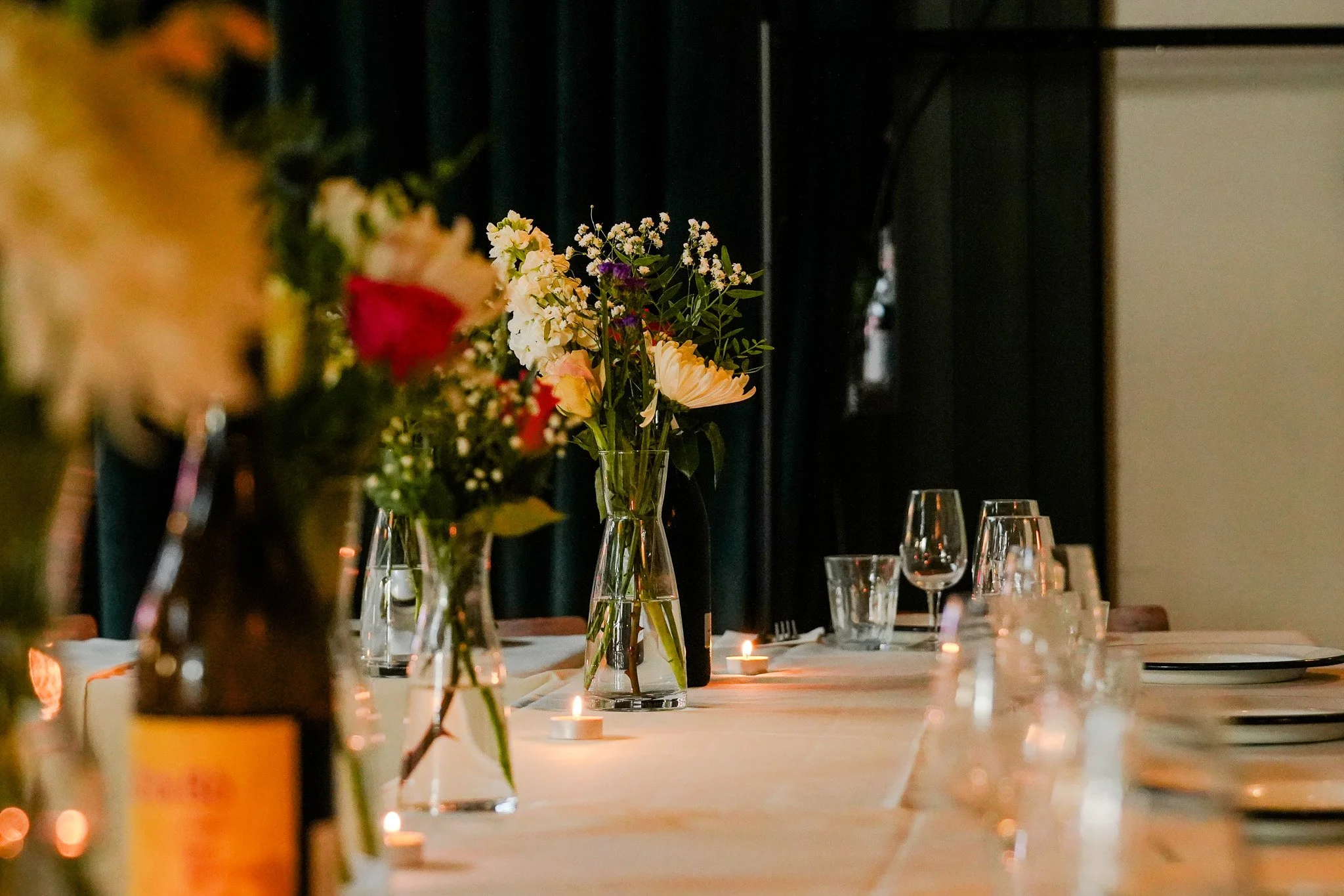 Long tables with candles and wine bottles.